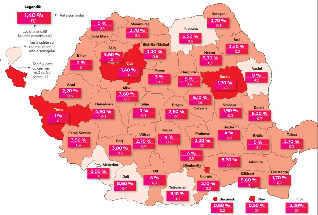 România, o țară a extremelor în șomaj: în unele judeţe şomajul sare de 9%, în timp ce altele funcţionează aproape la capacitate maximă, cu şomaj în jur de 1%