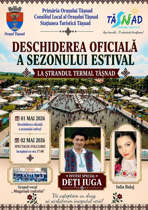 Deschiderea oficială va avea loc vineri, 1 mai, la Ștrandul Termal Tășnad, marcând începutul unui nou sezon de vară într-una dintre cele mai apreciate destinații de relaxare din zonă.