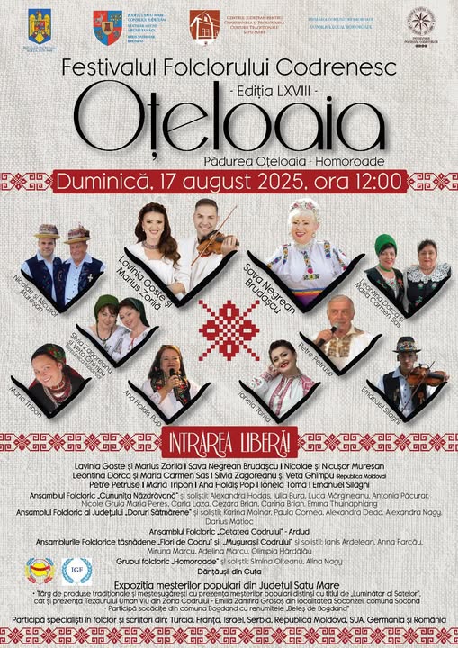 Duminică 17 august 2025, de la ora 12:00, va avea loc cea de-a LXVIII-a ediție a Festivalului Folclorului Codrenesc „Oțeloaia”, eveniment organizat de către Centrul Județean pentru Conservarea și Promovarea Culturii Tradiționale, cu sprijinul Consiliului Județean Satu Mare în colaborare cu Instituția Prefectului Județului Satu Mare, Primăria și Consiliul Local Homoroade și Pensiunea „Popasul Codrenilor”.